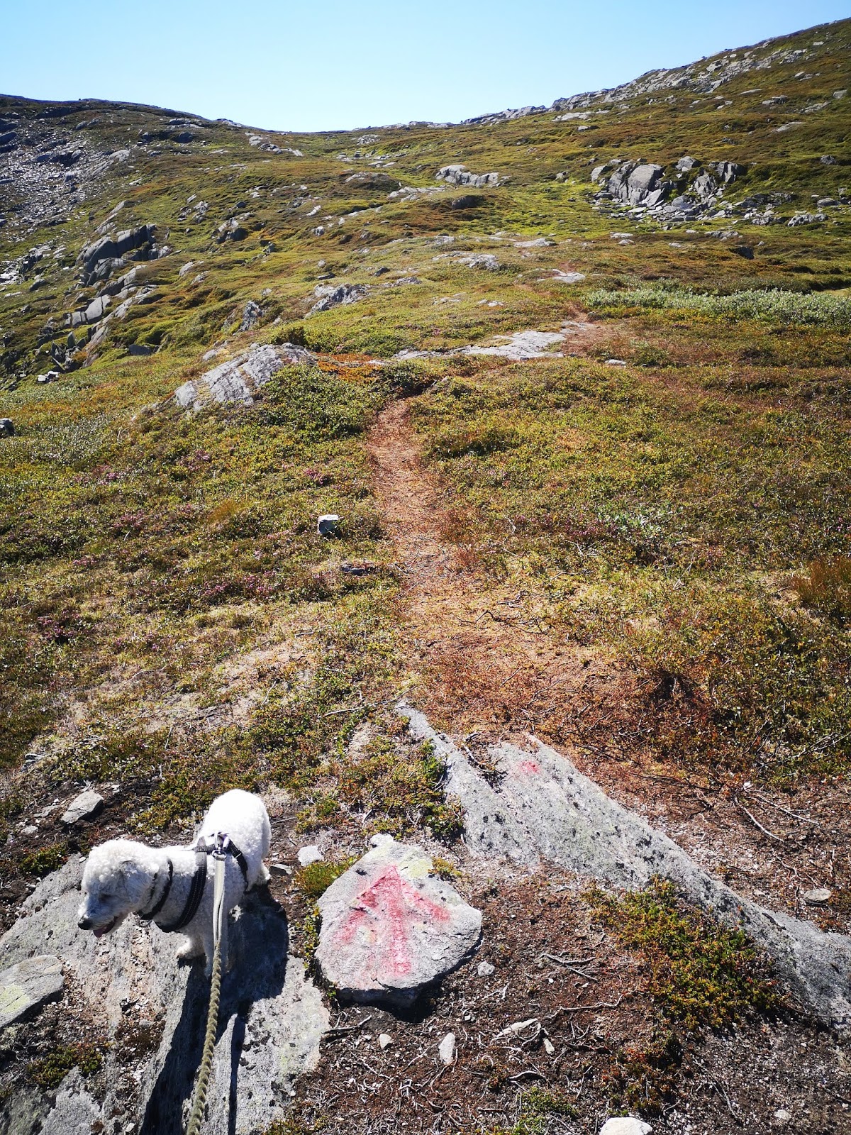 Då både vi og Prins hadde fått mat i kroppen, var det berre å sele på seg sekken for å kome seg vidare. Dagen vi hadde velt oss, var ein flott turdag, for temperaturen låg på rundt 20 grader, og vi såg allereie på parkeringsplassen at det var ganske mange andre som tenkte akkurat som oss.